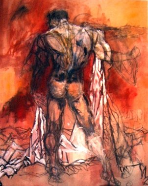 Unfortunately for man with drapes, there were very few viewers. This painting featured in a solo show at the now defunct Pi Bar (a MPLS GLBT night club), then hung on my studio’s wall for awhile. When I went to France, the boyfriend of a friend threw it in a dumpster after they had a fight. A loyal girlfriend of mine drove to the suburbs to rescue the piece, which was returned to me upon my return from France, months later. Man with drapes hung happily on my studio apartment wall for a time, and it was the favorite painting of my then long-distance boyfriend. When we broke up, I was maudlin. I piled all things that reminded me of him into a box, including a tiny plastic christmas tree, and this painting. I had ripped it from its stretcher and rolled up the canvas, shoving all into a box. I was going to send everything to him, but instead the box sat in my closet for over a year. Much later, in a purging mood, I decided to throw out the box. I had forgotten man with drapes was there entombed, and didn’t bother to remove the layers of packing tape securing the carton’s edges. Ultimately, man with drapes met his end in a crappy neighborhood dumpster, and is now lying buried under a trash heap, I presume.