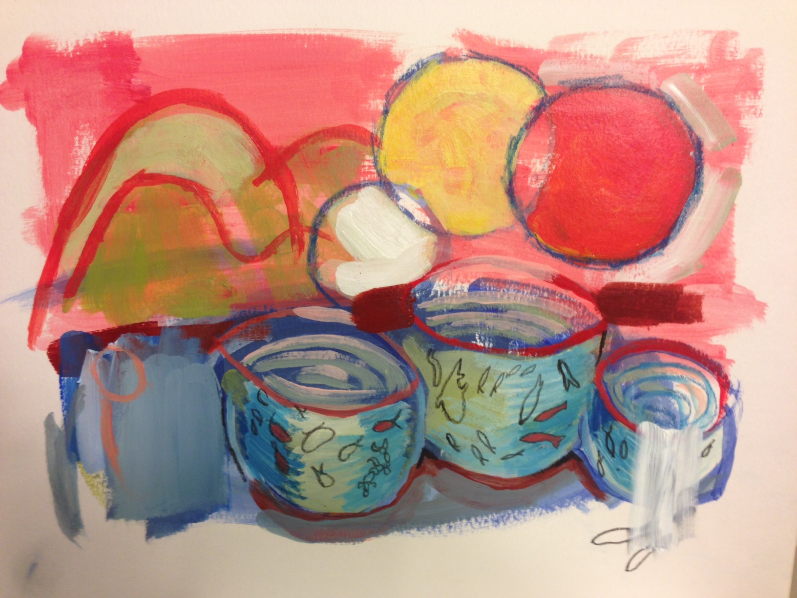An artist friend, Anna, told me – making resolute eye contact – that I need to electrify the apparently drab color palette I have allowed myself to succumb to. We were having an “art day,” which means we get together on her covered patio with Molly, her incredibly cute dog, chat for awhile, have a coffee, spend way too long getting our works space and materials set up, and try our damndest to advance our current projects while sort of cheering each other on. Anna was flinging colors around on a silk canvas in wide bars so vivid you could have mistaken it for a black-light luminescence poster we all know from our teenage years or stoner friends. I, five feet away, was scribbling blue ink into a tiny patch of bare canvas and diluting it with medium-heavy titanium white, carefully planning which color will come next, wincing at the surface like a math problem. I wasn’t having any fun with that, and predictably, I found myself staring at the colors an hour later and wondering how I had come up with such a stereotypical, elementary pairing of orange and blue without much else going on. Anna was right, I think, as she hands me a white wine spritzer (choice Art Day drink – or we are just women-around-thirty). My color capabilities have become flabby. Glug.