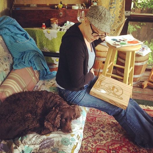 An artist friend, Anna, told me – making resolute eye contact – that I need to electrify the apparently drab color palette I have allowed myself to succumb to. We were having an “art day,” which means we get together on her covered patio with Molly, her incredibly cute dog, chat for awhile, have a coffee, spend way too long getting our works space and materials set up, and try our damndest to advance our current projects while sort of cheering each other on. Anna was flinging colors around on a silk canvas in wide bars so vivid you could have mistaken it for a black-light luminescence poster we all know from our teenage years or stoner friends. I, five feet away, was scribbling blue ink into a tiny patch of bare canvas and diluting it with medium-heavy titanium white, carefully planning which color will come next, wincing at the surface like a math problem. I wasn’t having any fun with that, and predictably, I found myself staring at the colors an hour later and wondering how I had come up with such a stereotypical, elementary pairing of orange and blue without much else going on. Anna was right, I think, as she hands me a white wine spritzer (choice Art Day drink – or we are just women-around-thirty). My color capabilities have become flabby. Glug.