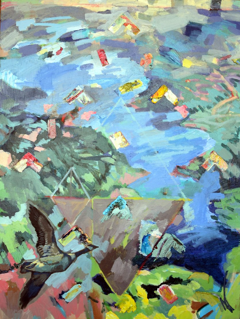 Longfellow Beach. 2025. Acrylic on canvas. 30″ x 40″Genetic Memory/Congenital Gifts. Mixed media on canvas. 36″ x 36″Resonance. Acrylic on canvas. 24″ x 36″Dans La Campagne. Acrylic on canvas. 30″ x 40″Formation v. Migration. Acrylic and ink on canvas. 18″ x 24″Lepomis gibbosus (Pumpkinseed Sunfish). Acrylic and ink on canvas. 12″ x 16″Denali. Acrylic on canvas. 11″ x 14″Flying Shapes (working title). Acrylic and ink on canvas. 18″ x 24″Bather at Holland Lake. Acrylic and ink on canvas. 24″ x 36″Dynamo I: Nine Blackbirds. Acrylic, charcoal, ink on canvas. 40″ x 40″Dynamo II: Migration Motion. Acrylic, charcoal, aquarelle, collage on canvas. 36″ x 60″Ursus arctos horibilis. Acrylic on canvas. 9″ x 12″Cellular Respiration