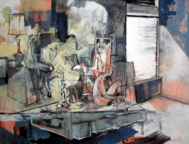With this commission, I decided to start with a simple composition of arranged “vessels,” the various containers, plastic jugs, mason jars and empty fruit cups repurposed for paint that litter my studio. I “filled” or imbued the skeleton drawing of the piece with the “core” of my own formal artistic sensibilities: expressive color and brushstroke patterns, heavy contrasts between muted, cold tones and vibrant, living hues, struggle between linearity and ambiguity, representation and abstraction. Throughout the process, I paused to examine my thoughts and actions, took notes, looked inside to acknowledge the intuition that guided my hands, something I have rarely done on purpose. In this way, Vessel Work feels like a deliberate meditation on the spiritual, inner aspect of art creation and what it means to me personally.