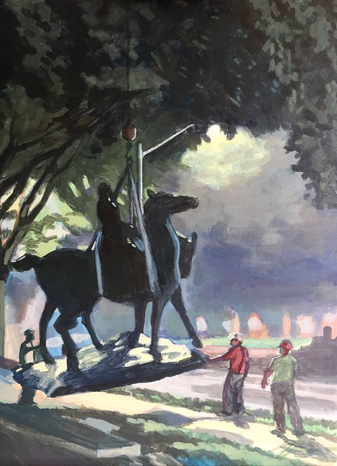 Removal of a Confederate Monument at Baltimore, MD, or Flight of General Robert E. Lee (working titles). Acrylic on canvas. 18 x 24.