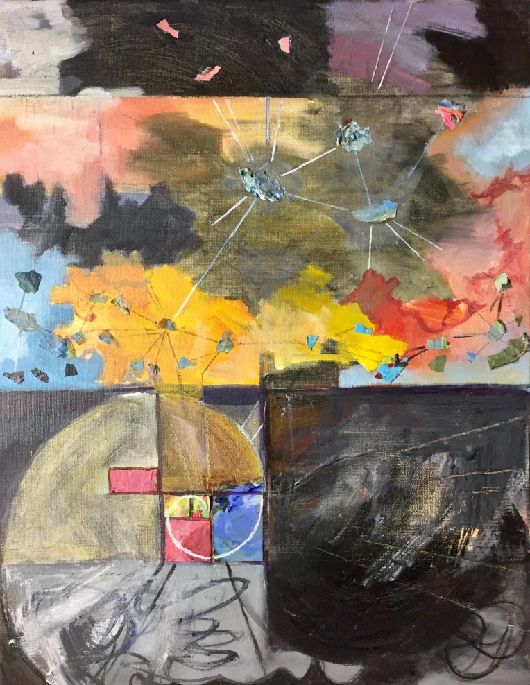 Flying Shapes (working title). Acrylic and ink on canvas. 18″ x 24″